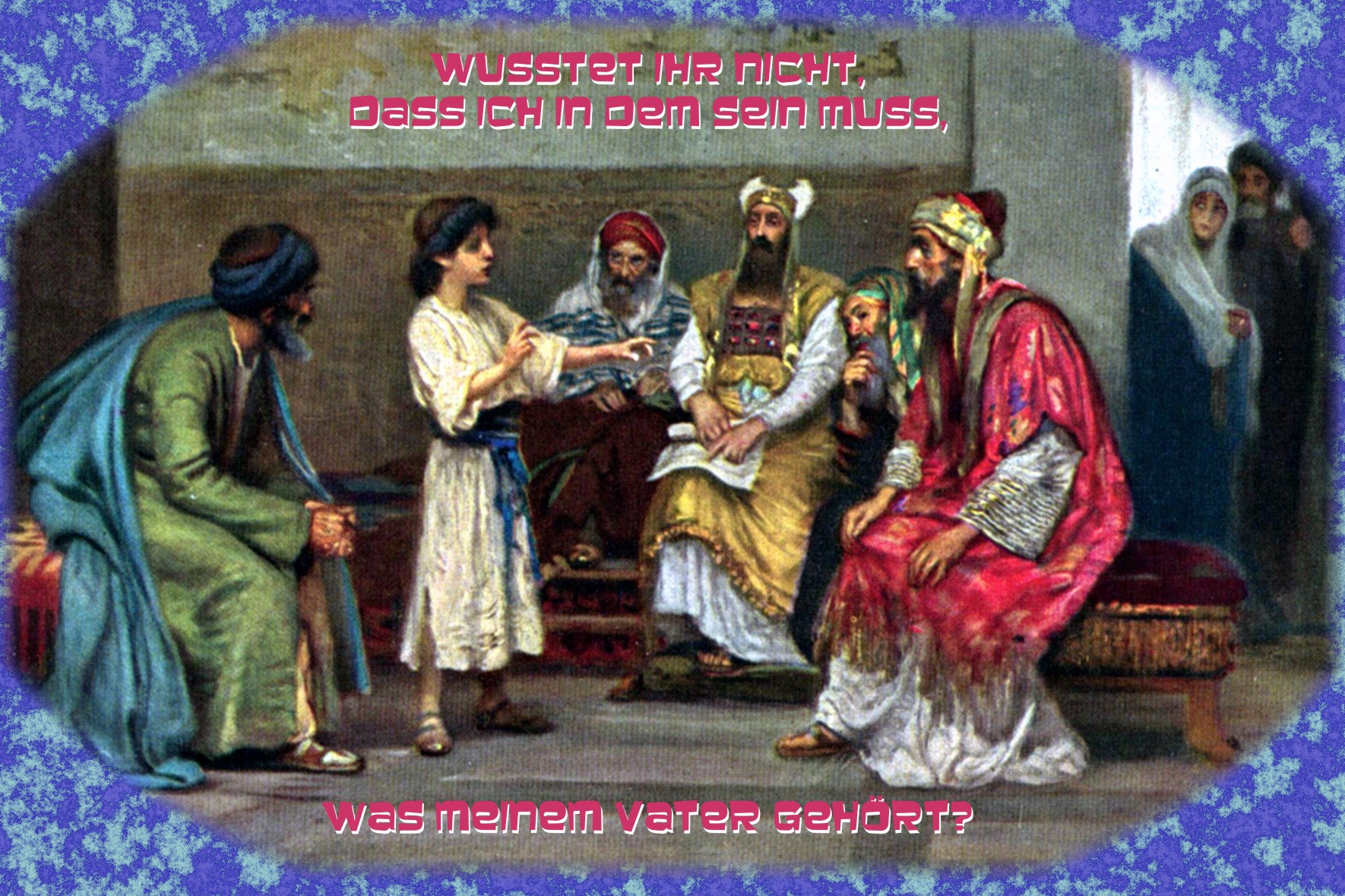„Als er (Jesus) zwölf Jahre alt geworden war, zogen sie wieder hinauf, wie es dem Festbrauch entsprach. Nachdem die Festtage zu Ende waren, machten sie sich auf den Heimweg. Der junge Jesus aber blieb in Jerusalem, ohne dass seine Eltern es merkten. Sie meinten, er sei irgendwo in der Pilgergruppe, und reisten eine Tagesstrecke weit; dann suchten sie ihn bei den Verwandten und Bekannten.“ (Lk 2, 42-44)