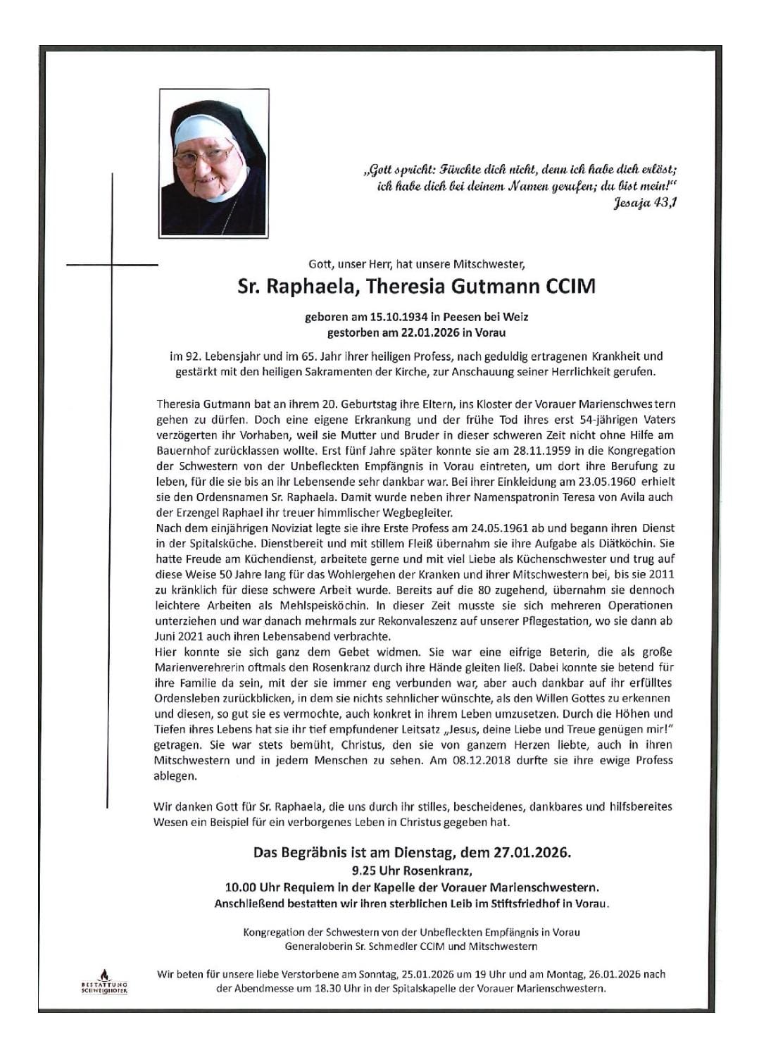 Nach geduldig ertragener Krankheit und gestärkt durch die Sakramente der Kirche durfte Sr. Raphaela am Donnerstag, dem 22. Jänner, heimgehen zu Christus.