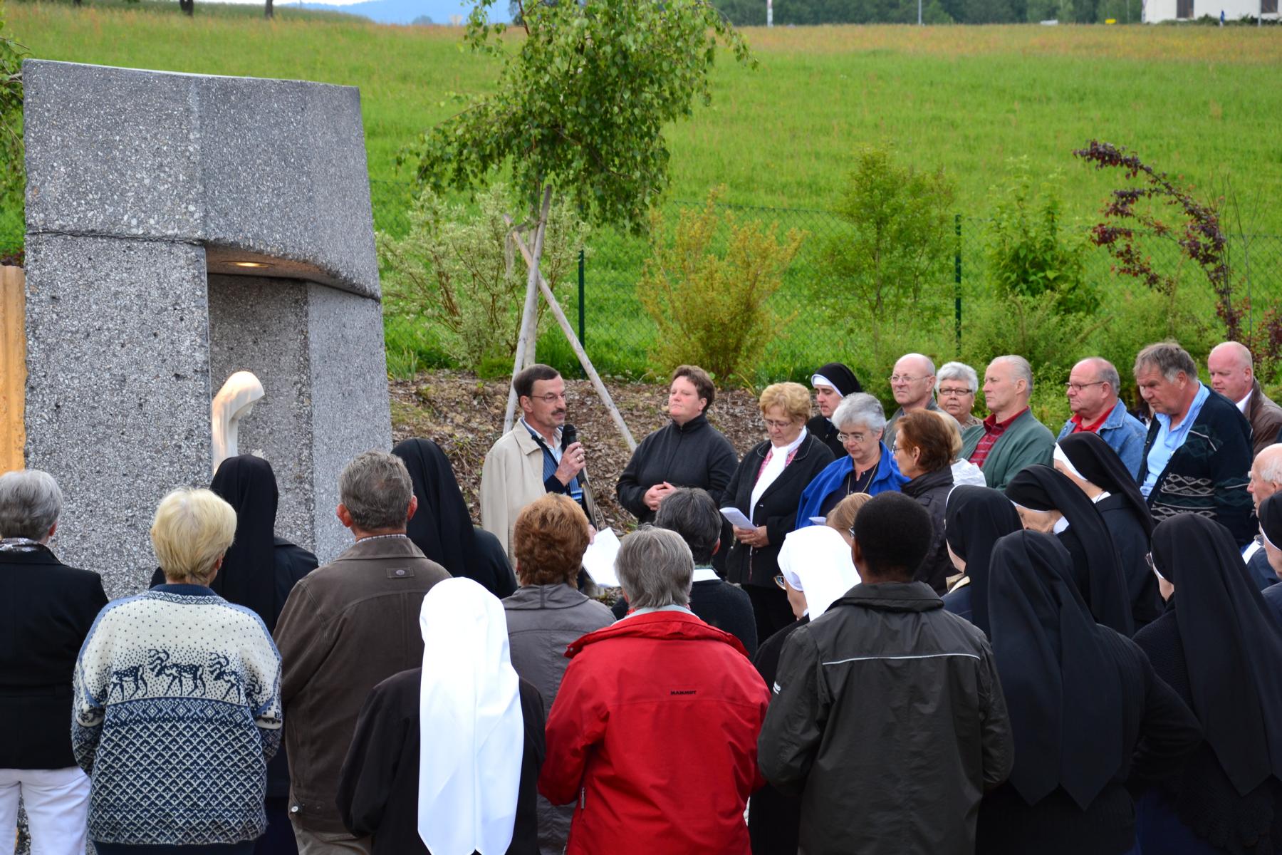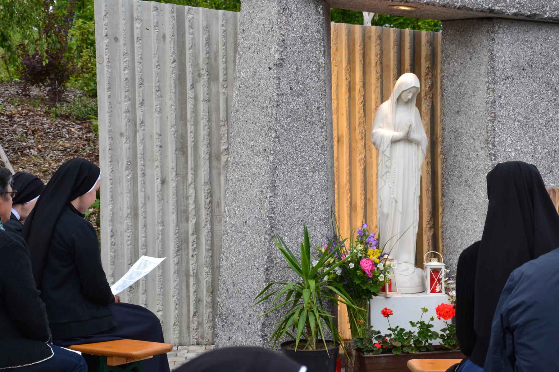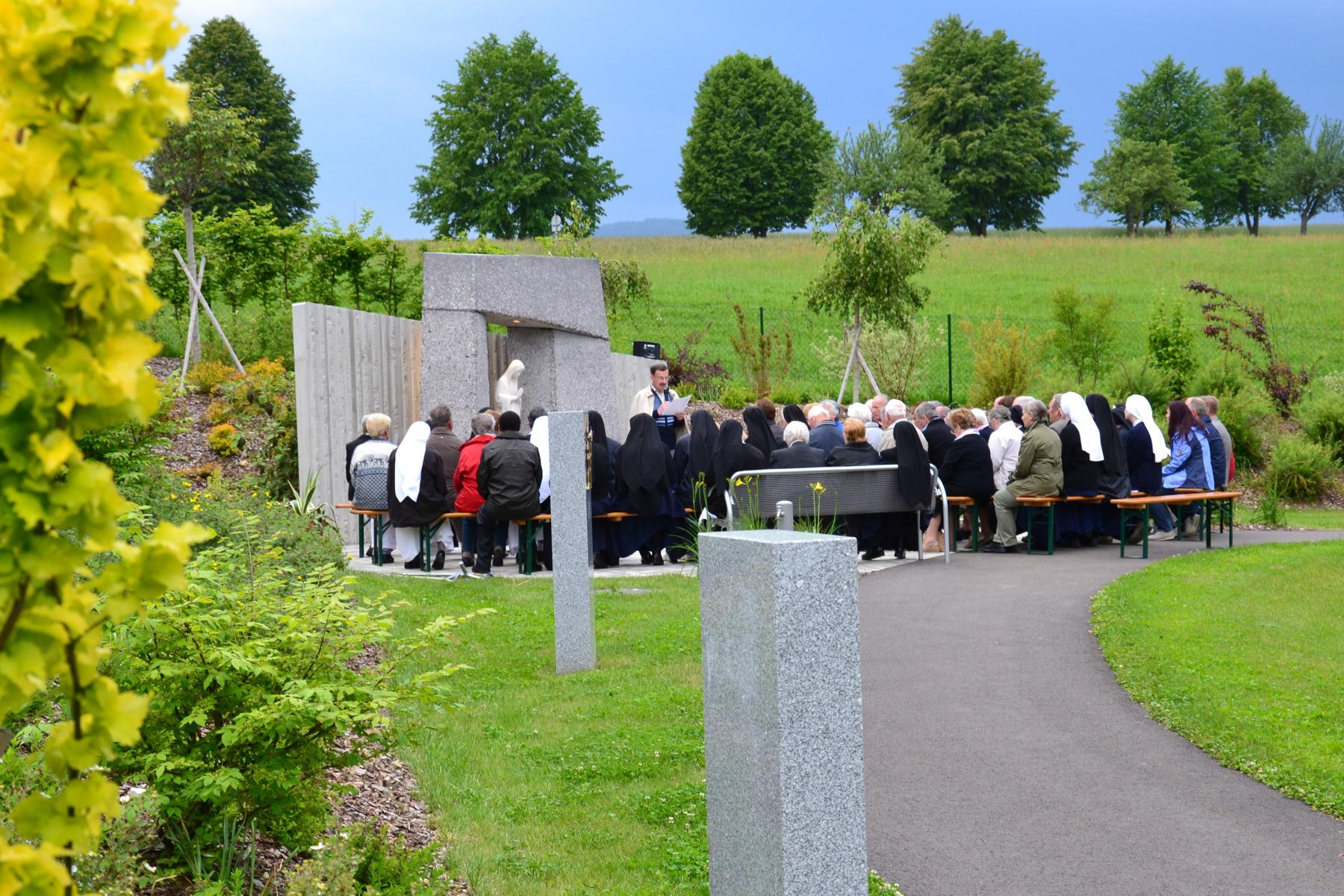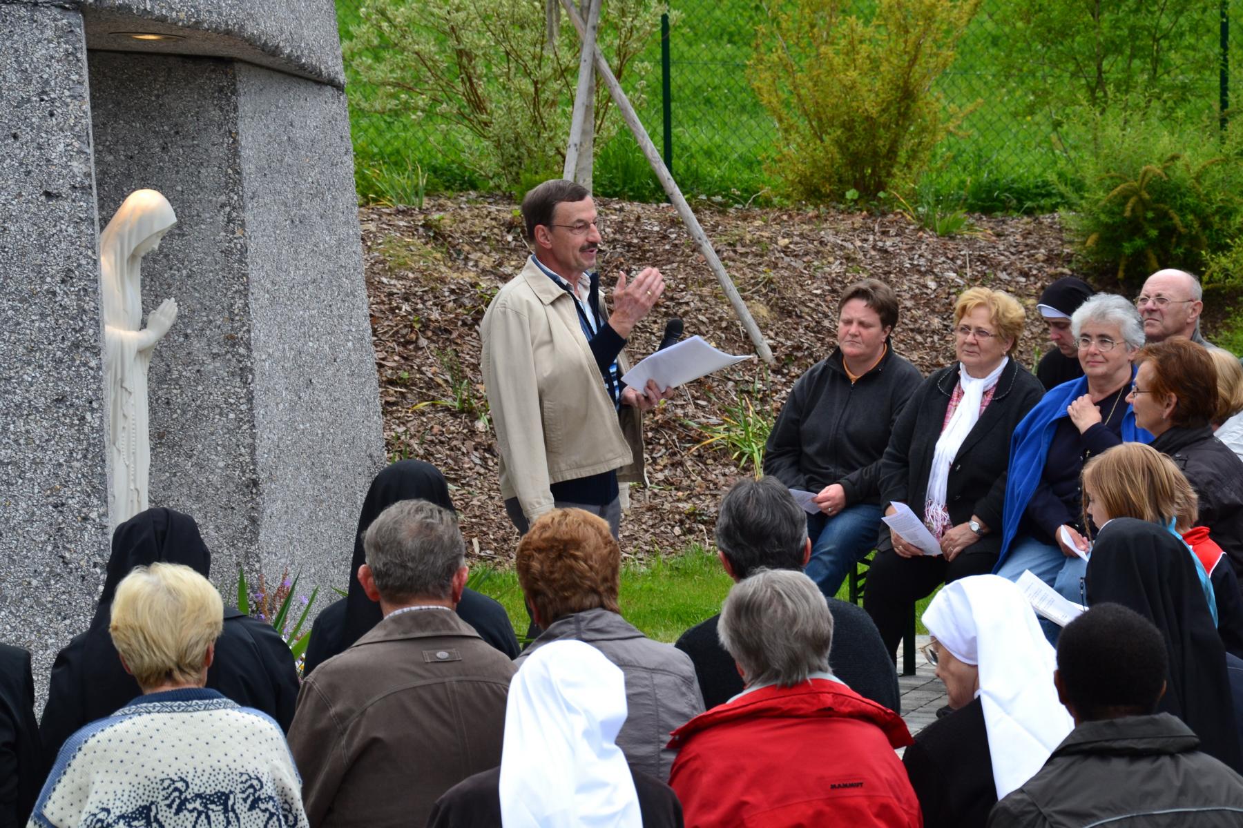 Trotz des wankelmütigen Wetters hatten wir Glück und konnten die alljährliche Maiandacht mit den Bewohnern der Badsiedlung im Freien abhalten. Etwa 80 Gläubige versammelten sich in unserem Klostergarten bei der Mariengrotte, bei der „Jungfrau der Armen“ (Banneux).