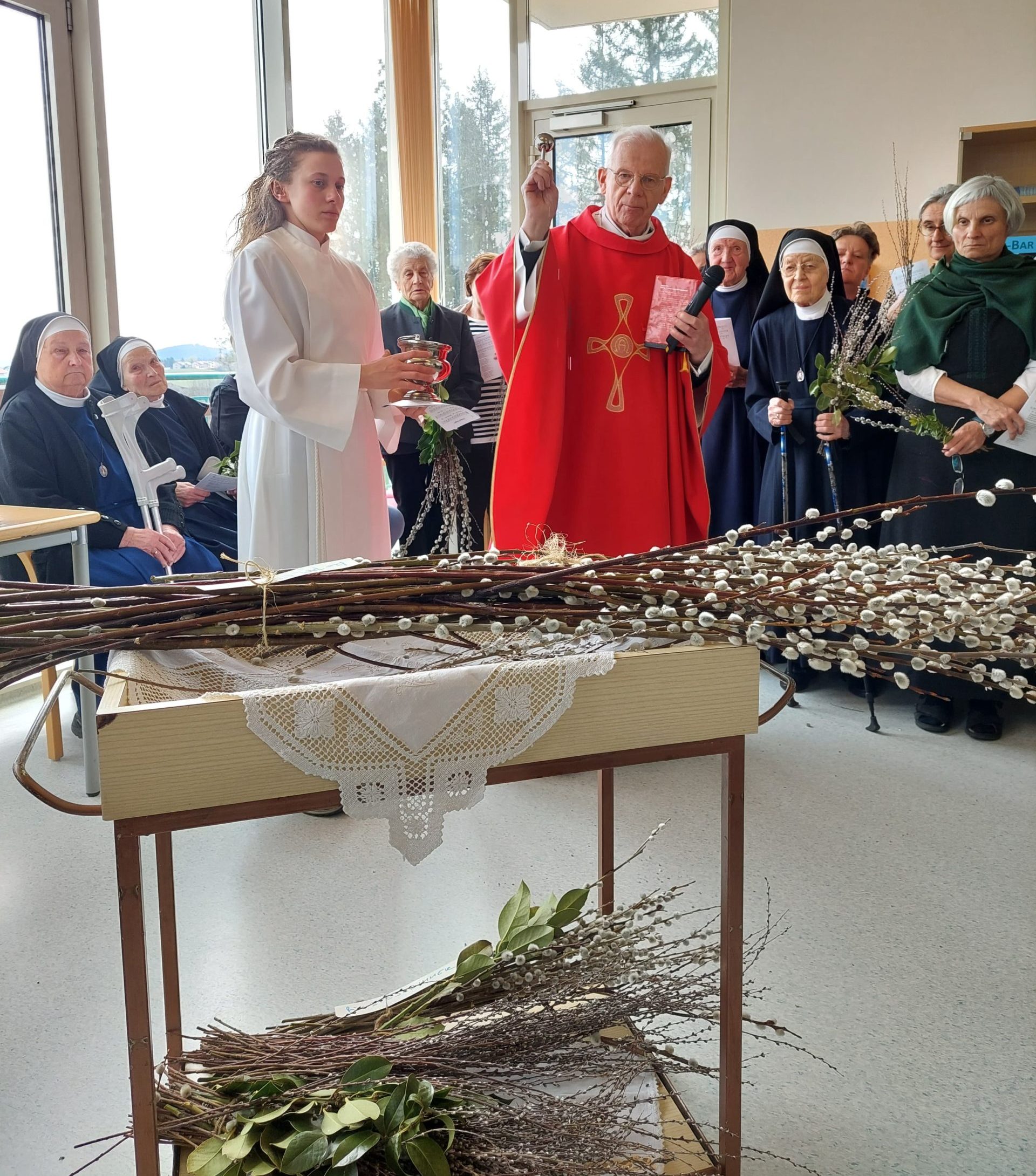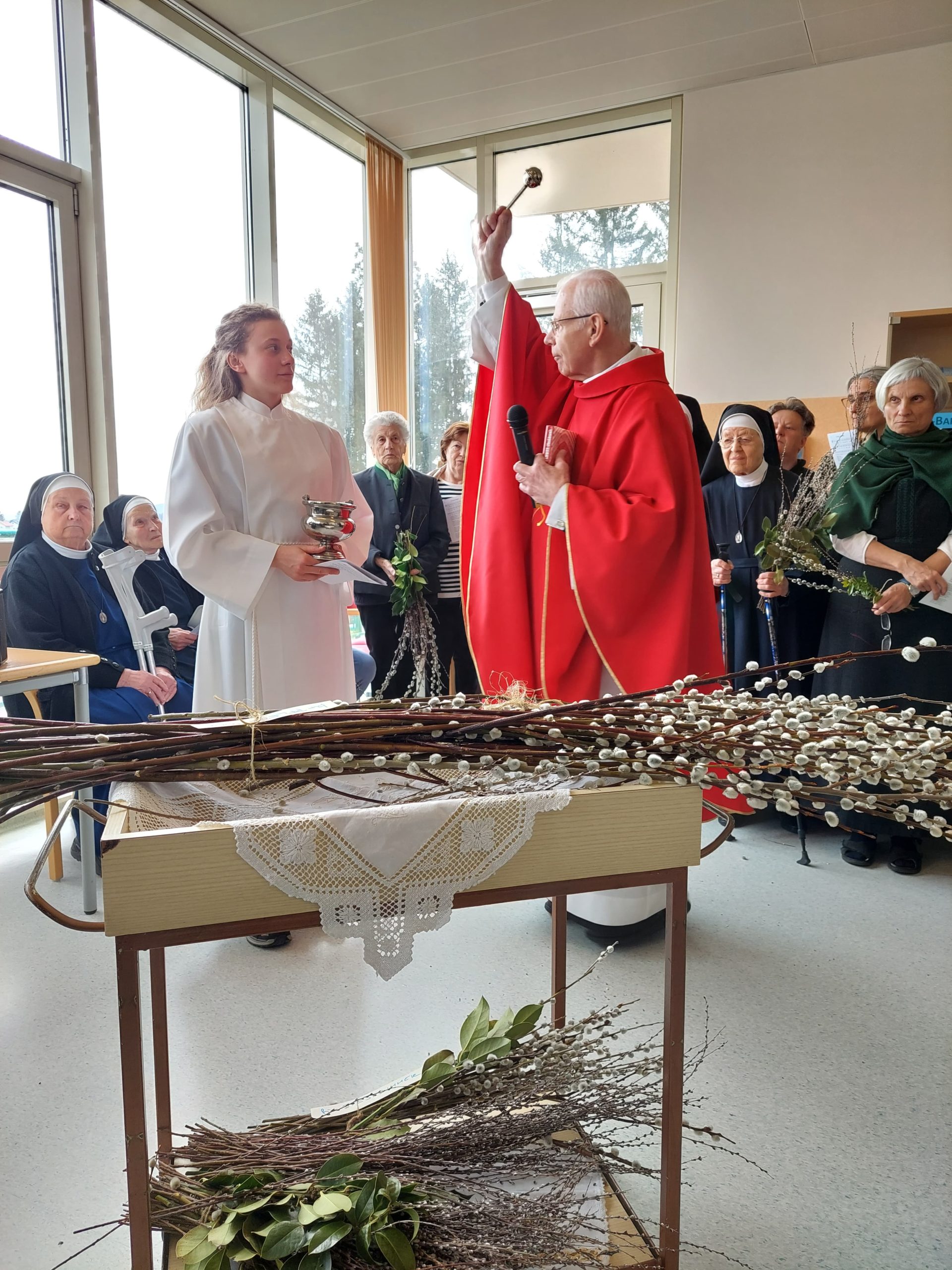 Die Palmweihe findet im Wintergarten unserer chirurgischen Station statt, danach ziehen wir in einer Prozession in die Kapelle.