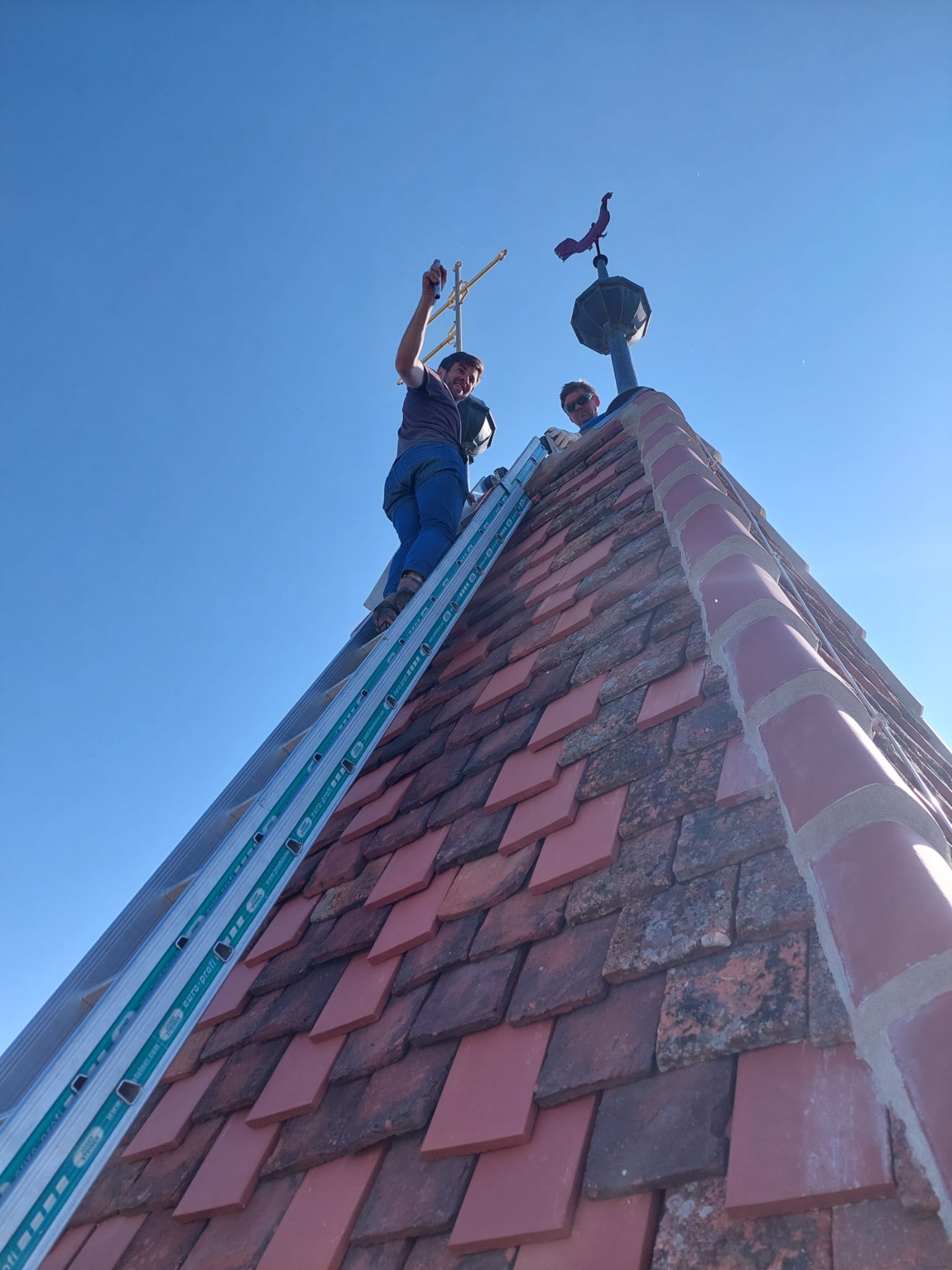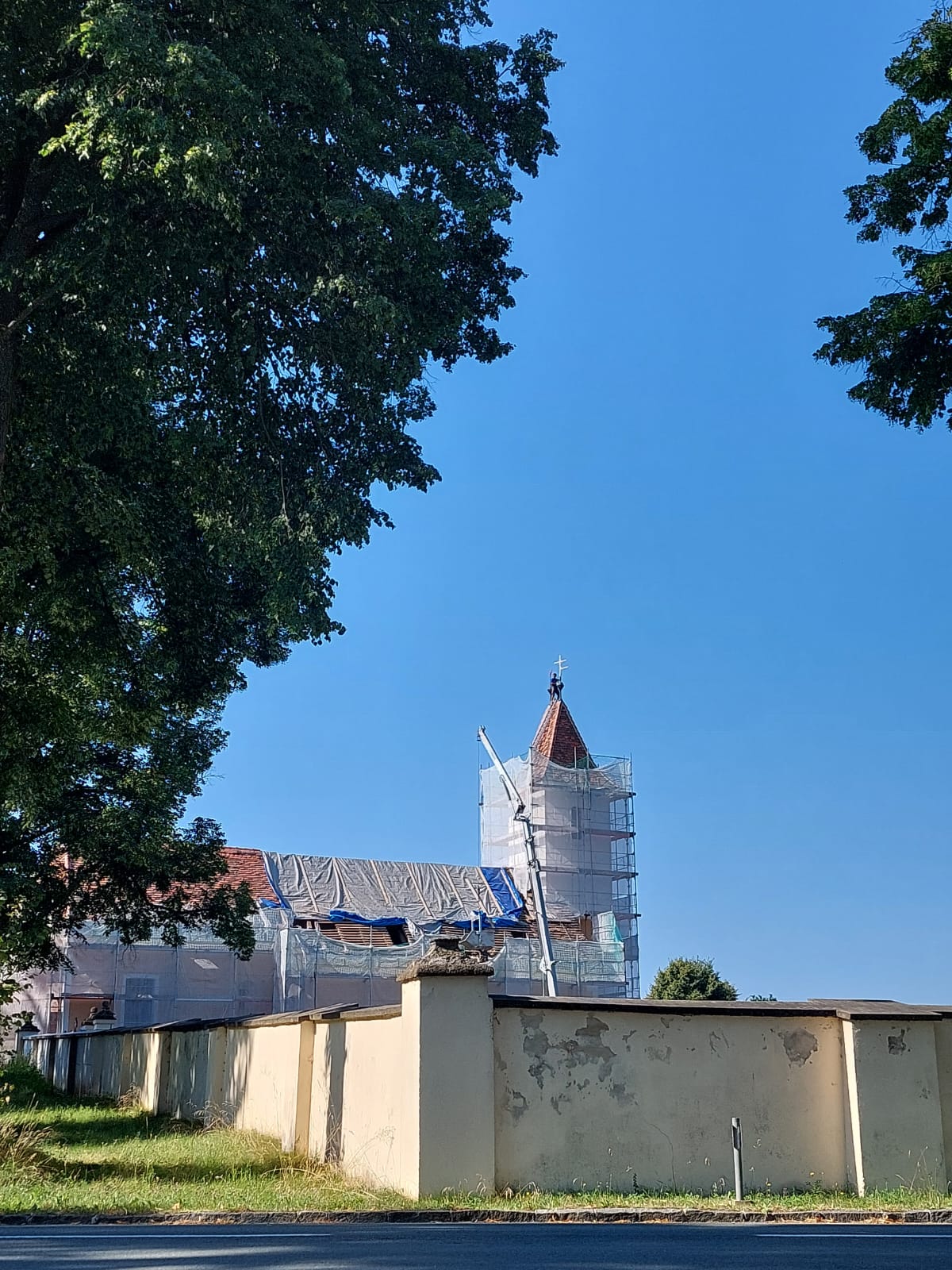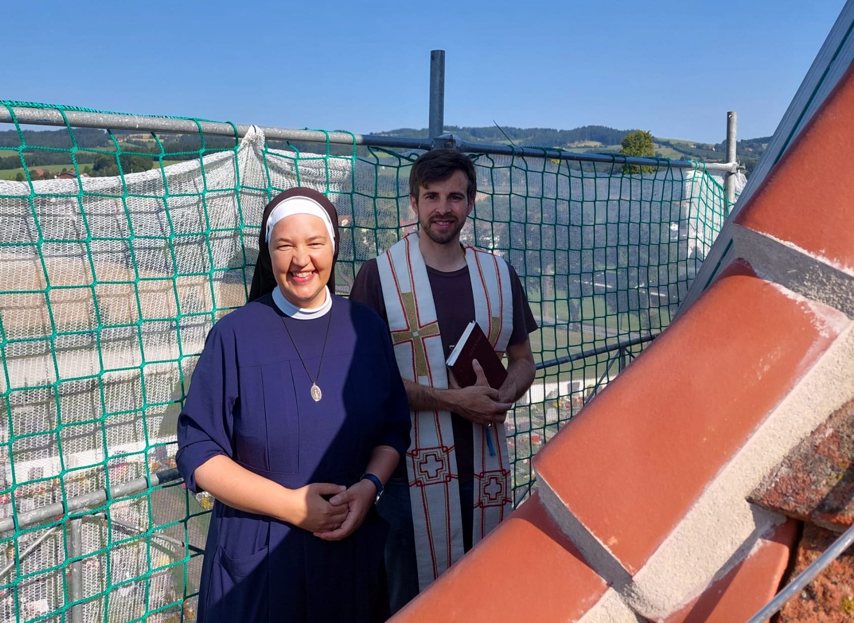 Die Johanneskirche am gleichnamigen Friedhof wird gerade renoviert und hat ein neues Kirchturmkreuz erhalten. Gemeinsam mit Propst Bernhard Mayrhofer, der die Segnung des Kreuzes vornahm, wagte sich auch unsere Mutter Oberin in luftige Höhen.
