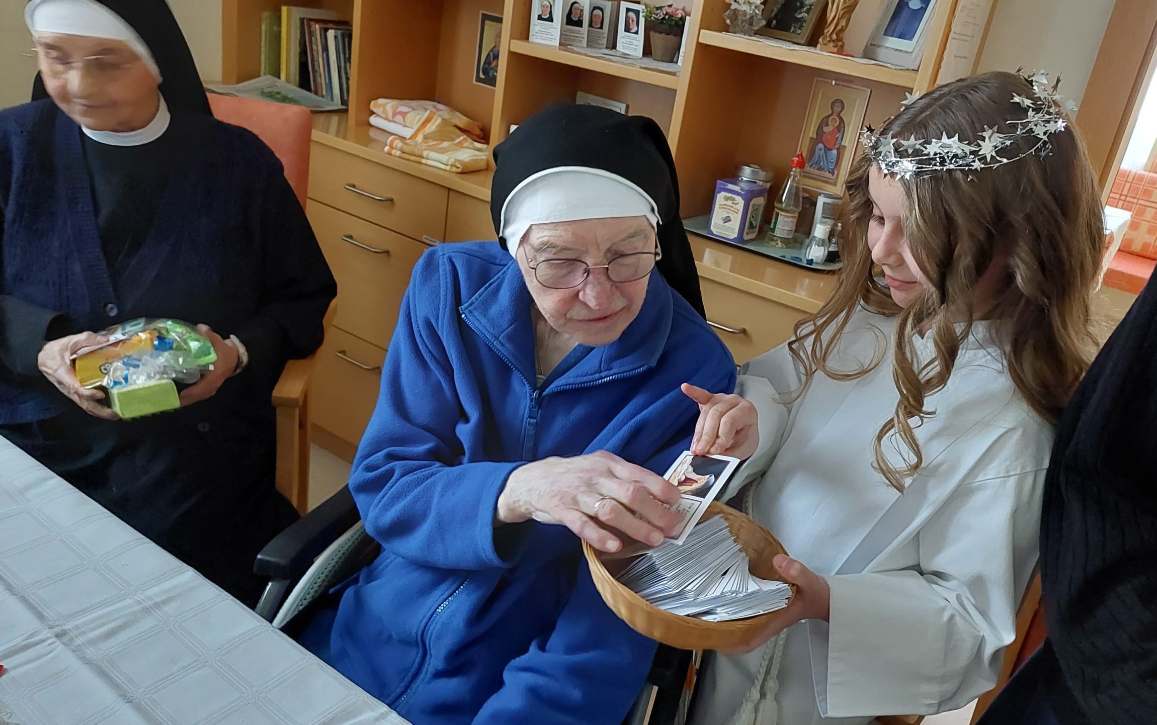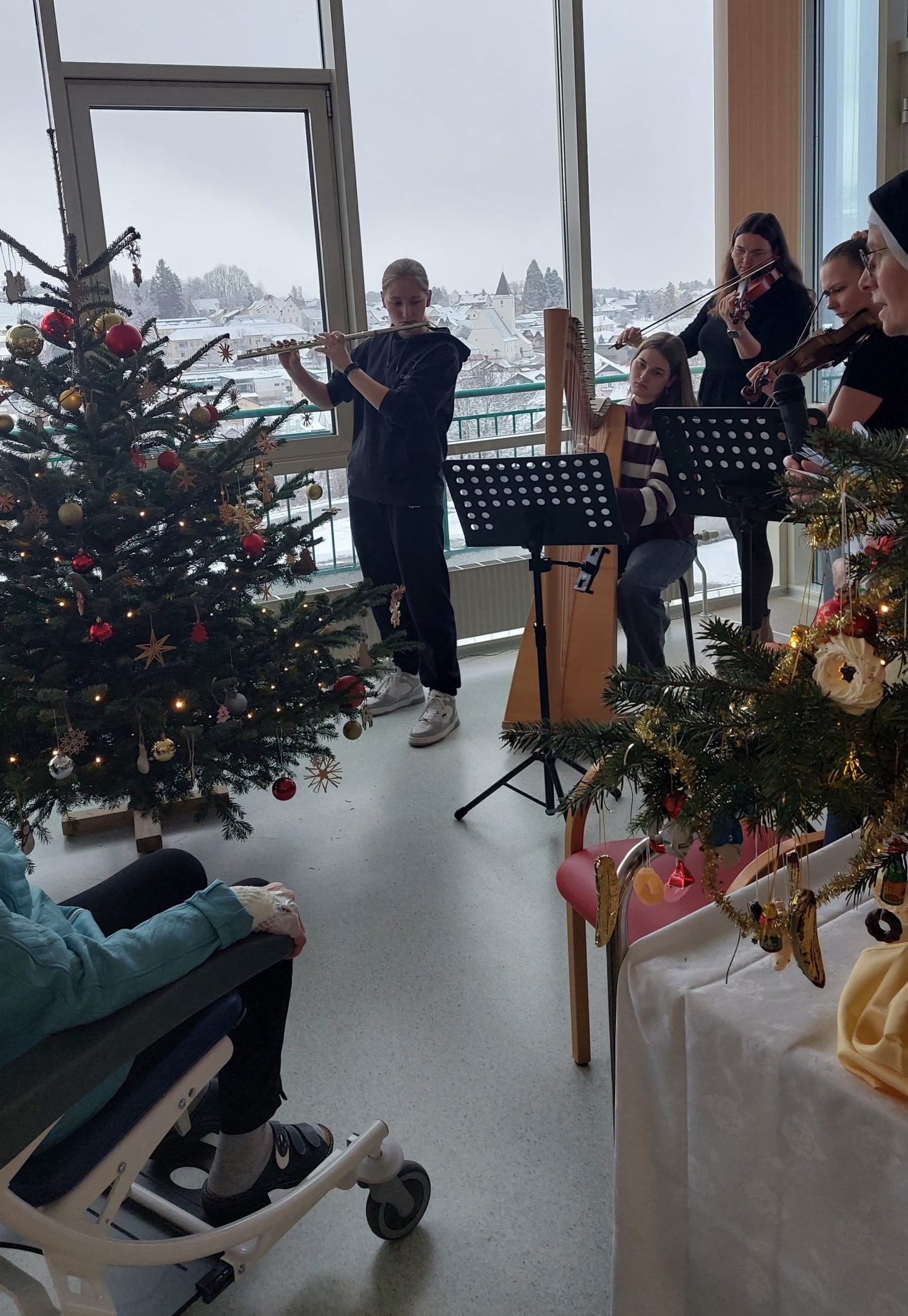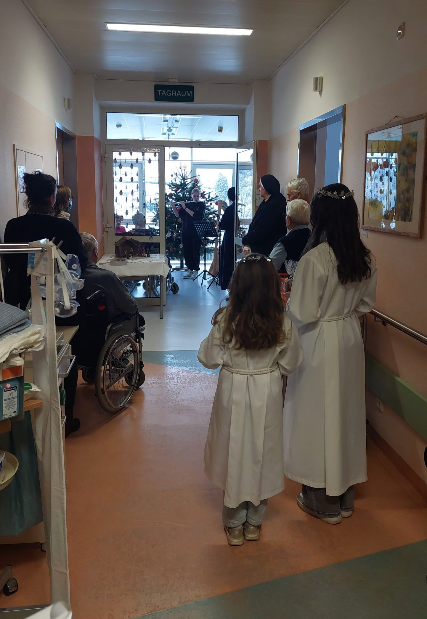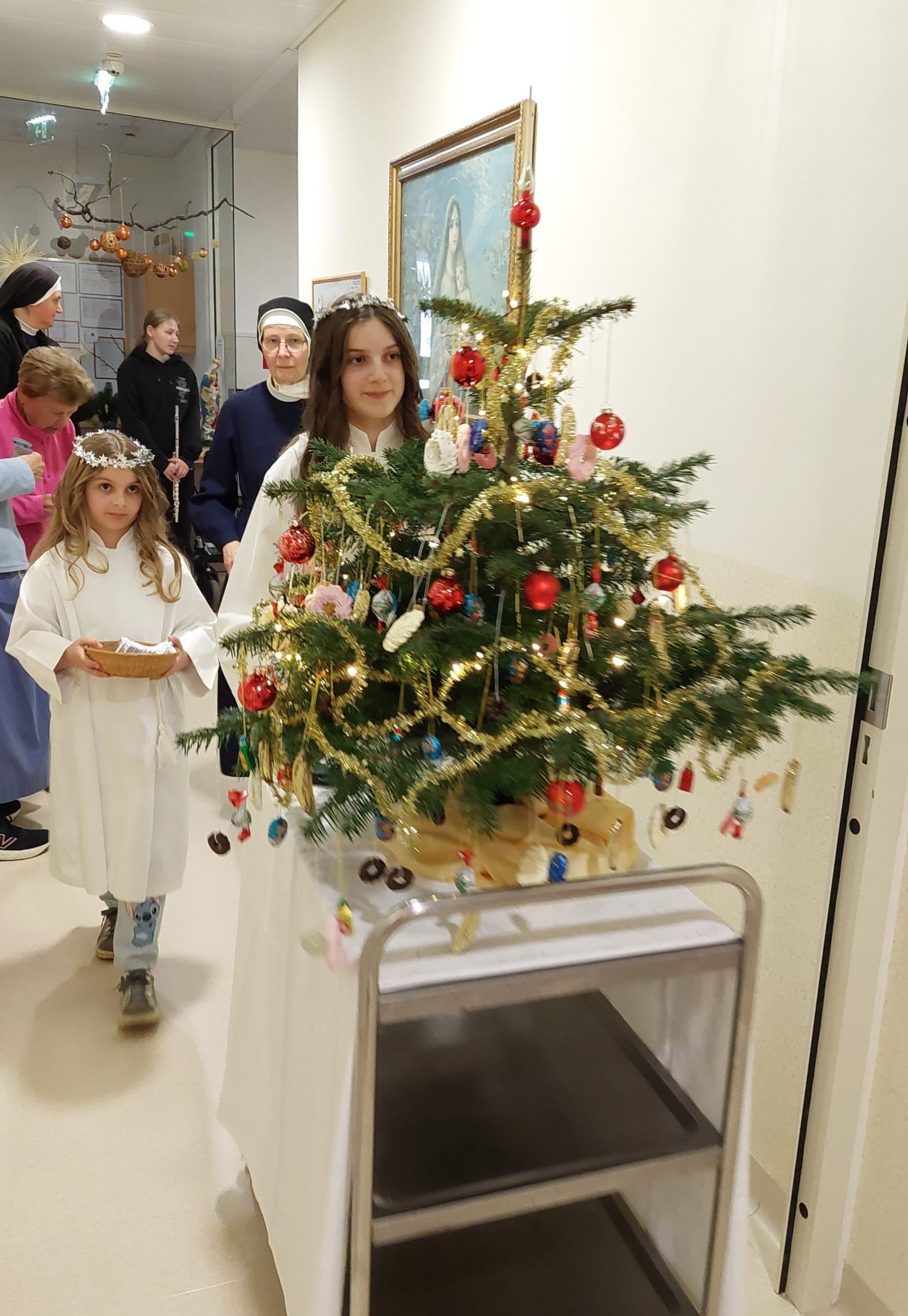 Am Nachmittag des 24. Dezembers sind im Marienkrankenhaus unsere Engel und Mädchen, die musizieren, unterwegs. Ein geschmückter Christbaum erfreut Groß und Klein. Wir besuchen die Patienten und Mitarbeiter. Es wird das Weihnachtsevangelium verkündet, gesungen, und die Engel verteilen an alle Geschenke.